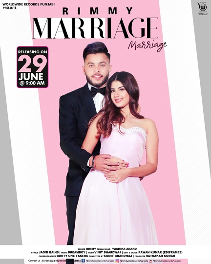 सिंगर रिम्मी का जल्द ही वर्ल्डवाइड रिकार्ड्स पंजाबी से ‘मैरिज’ सांग रिलीज होने जा रहा है। ये सांग 29 जून सुबह 9 बजे वर्ल्डवाइड रिकार्ड्स पंजाबी के ऑफिसियल यूट्यूब चैनल पर रिलीज हो रहा है। सांग का फर्स्ट लुक आउट कर दिया गया है। जोकि सोशल मीडिया पर चर्चा का विषय बना हुआ है। इस पोस्टर में सिंगर-एक्टर रिम्मी और एक्ट्रेस याशिका आनंद शादी के जोड़ा पहने नजर आ रहे हैं।