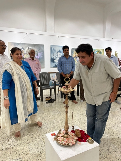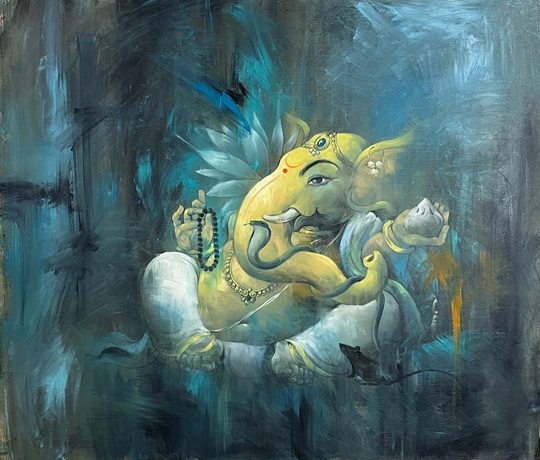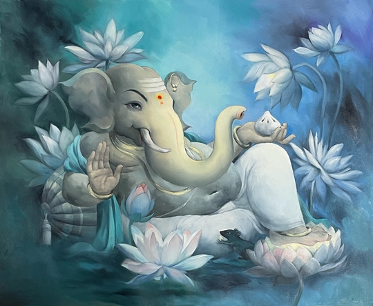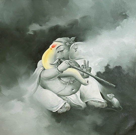 The present exhibition showcases various sentimental divine aspects associated with Lord Ganesha and the spiritual fervour attached to the same. He has also used calligraphy to reveal Vedic and religious hymns and cultural vignettes at the background while depicting the various moods and eternal expressions of Lord Ganesha in vivid positions and the relevant anatomical details thereof to yield the expected divine visual effect to the creative endeavour. He has artistically presented Lord Ganesha in different divine forms in his work alongwith the aesthetic revelation of the spiritual effects and their fervours in an artistic way. Each work is unique and has its own characteristic visual quality via the desired visual effects at the strategic arenas therein such as various ornaments, anatomical divine gestures and the blessing as well as playful forms etc. in the relevant perspectives of visual fine arts.