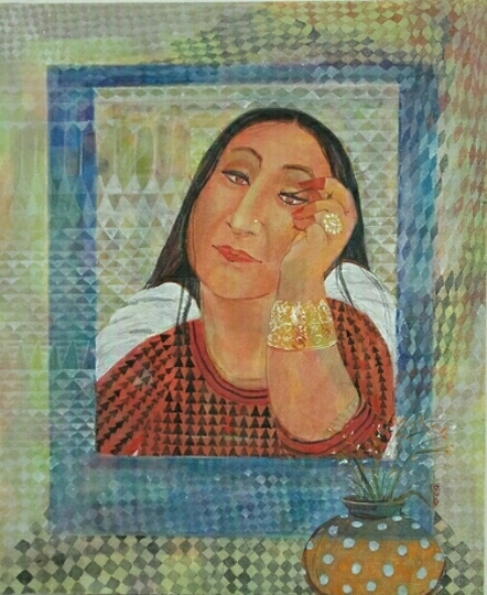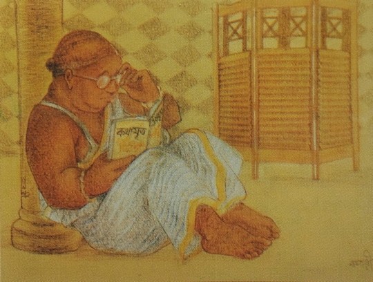 Kabari Banerjee Mukherjee: She has made paintings using tempera on canvas. Her theme denotes old people spending their leisure time to fulfil their hobbies and doing the things they love. Her paintings try to put forward the emotional aspects of such characters in a simple and lucid style of expression.