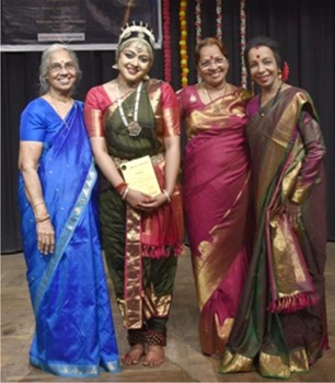 The prelude was set with the sound and silence defined through an intricate Alarippu in Sankeernajathi Triputa Thalam ( 13 ahsharams) by Lata’s dedicated Senior disciple Kum Ananya Mohan Iyer . The live orchestra with Lata herself deftly wielding the Nattuvangam , melodious Keerthana Krishnan Vocal Shri Chandran – Mridangam and Violin by Shri Balasubramaniam highlighted the Guru-shishya connect beautifully!The crossrhythms , the potent silence and sound interludes and the dialogue between thalam,percussion and Visual kinesthetics of BharataNatyam caught everyone ‘s attention . The interesting aspect was the weaving of Surdas ‘s composition into the traditional Dhanyasi Varnam by Papanasam Shivam that followed , to have the cosmopolitan crowd connect to the colour that is a Varnam, highlighting the universality of emotions in man be it any terrain.