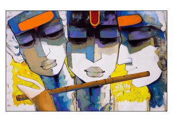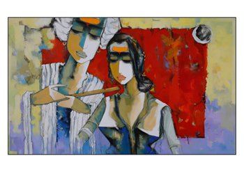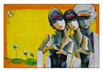 Sharad Kale’s style represents this genre as well. When regarding each of his works individually, one cannot escape the feeling of serenity, calmness, and divinity, all at once. His works are lyrical and create a rhythm that engrosses and transpires the viewer into a state of total bliss. Kale uses his canvas surface in a poetic manner, with his human figures and nature in complete synchrony. The artist invariably employs a bright palette that is bold and colorful, leaving the spectator elated.