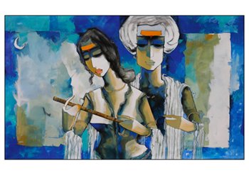 Sharad’s works mostly depict people from rural areas who are in love. This can be readily discerned by observing the expressions of his subjects. Both men and women’s faces show shyness and deep affection. Moreover, their faces are those of people who are pure and unaffected by the complicated urban world outside the villages. They are dressed in traditional Indian attire. One of the common elements in a few of his works is the flute. Lord Krishna, the romantic god, was known to have played a flute for his Gopis. The moment one sees the flute in Kale’s paintings, they are transported to that era. It brings a feeling of spirituality and divinity to the spectator. He then complements his subjects with natural elements such as flowers, foliage, and sometimes the moon, further enhancing the aura of romance in his composition.