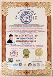 From International platform American University honoured with Doctorate for his selfless Social work towards society.